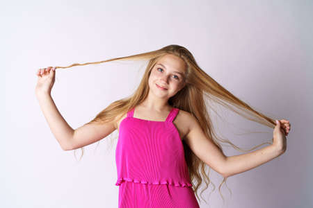 A cute and happy girl of Caucasian appearance in pink clothes on a white background plays with her long hair.