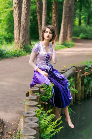 young woman in a lilac dress sits by the lake against the backdrop of trees in the park