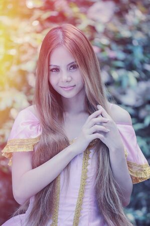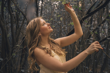 Princess in vintage dress walking in magic forest