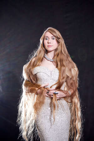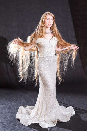 Young attractive girl with long blonde hair and beautiful dress in studio on dark background
