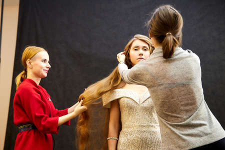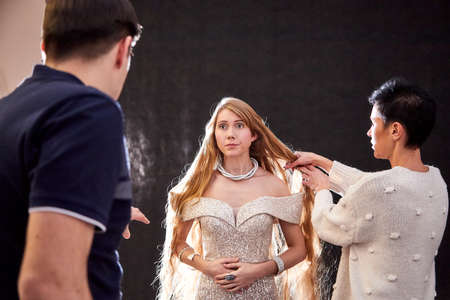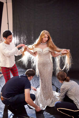 KIROV, RUSSIA - NOVEMBER 09, 2019: People help model during a photo shoot in the studio