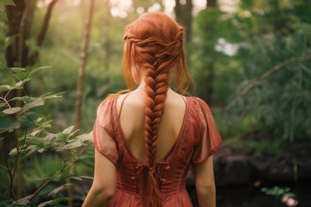 A woman stands with her back to the viewer, showcasing a braided hairstyle adorned with small flowers. Sunlight filters through the trees, creating a peaceful atmosphere.