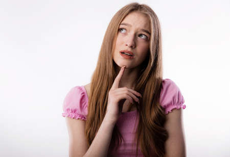 Thinking woman pondering over something. Casual young woman holding a finger near the face and thinking isolated on white background