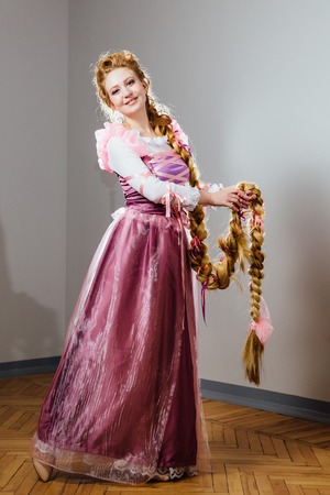 beautiful young girl with curly hairstyle. Magnificent princess in vintage dress