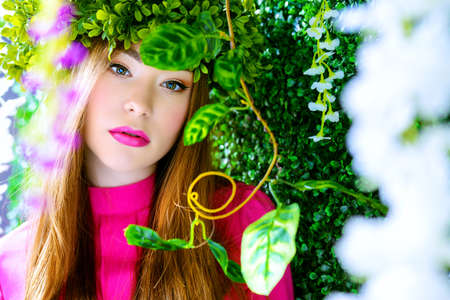 Spring girl portrait. Tender young woman in a wreath of green plants. Beauty, fashion concept. Cosmetics and perfumery.