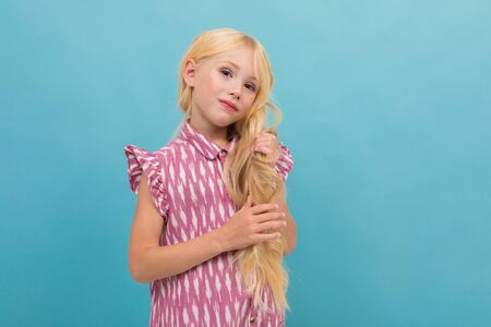 Little caucasian girl in pink dress with long blonde hair isolated on blue background.