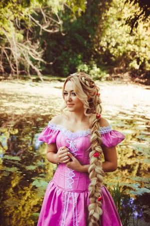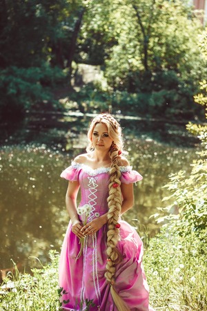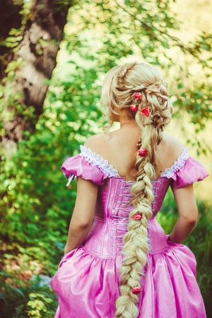 Beautiful girl with long hair braided in a braid, in a beautiful hairstyle in a corset and a magnificent pink dress standing with her back in the woods.