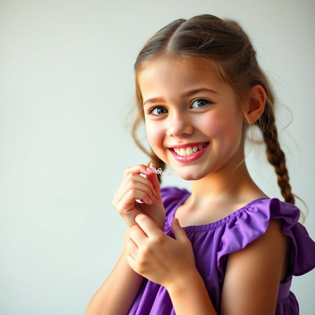 Portrait of a cute little girl with pigtails in a purple dress.