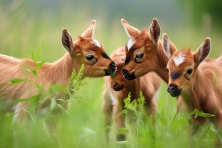 group of tiny goats head-butting and playing in green meadow, created with generative ai