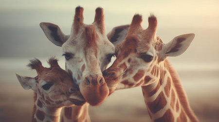 Three giraffes share a tender moment as they gently touch noses in the warm light of sunset. This captivating scene showcases the beauty of wildlife and the deep connections found in nature.