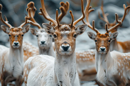 A serene herd of majestic deer is standing gracefully in the soft, white snow while curiously looking directly at the camera capturing the moment