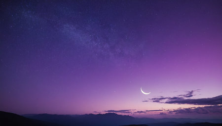 Delicate crescent moon illuminates the night sky amidst twinkling stars and serene darkness