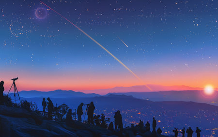 Starlight cascades over a sociable group atop a mountain crest, telescopes trained on the heavens as twilight merges with night