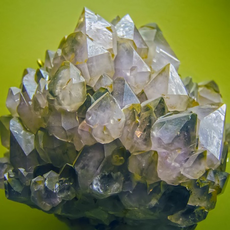 Cluster of natural quartz crystals with translucent sharp facets in warm soft light