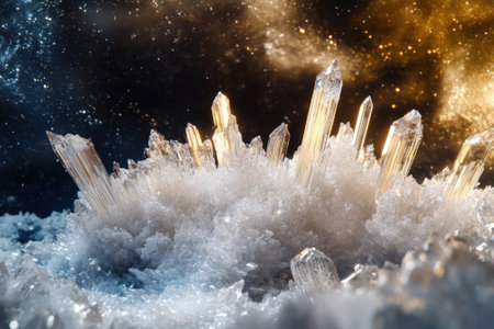 Quartz crystals jut majestically from a snowy mineral bed while cosmic stars twinkle in the background.