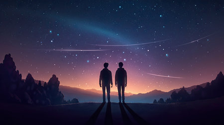 silhouette of a couple with their backs turned, standing on top of a hill, witnessing the beauty of a meteor shower in the night sky generative ai