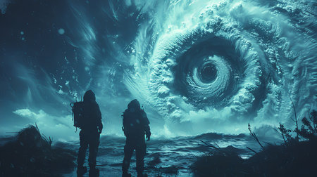 A man in the snowy north looking at a black hole in the sky. Generative AI image