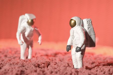 A couple of toy astronauts standing on top of a dirt field. Generative AI image.