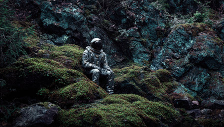 An astronaut figure sits amidst dense green moss and dark rock formations. The image uses a cool color palette with high contrast, creating a mysterious and somewhat melancholic atmosphere. The lighting suggests an overcast environment, potentially outdoors, with details hinting at a natural setting. This image is suitable for various commercial uses related to exploration, space, and adventure.