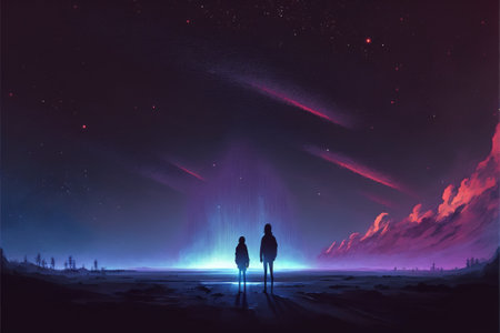 A man and a woman in love against the background of the night sky. Young couple, boy and girl look at mysterious light in the night sky. Digital art style, illustration painting.