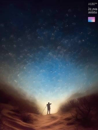 A striking image depicting the silhouette of a solitary figure looking up at the sky in a surreal, ethereal environment. The man stands alone in a mystical landscape, symbolizing introspection
