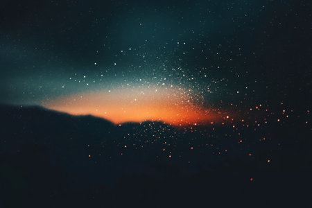 A blend stunning of colors fills the dusk sky with deep blues, oranges, and hints of violet. Tiny sparkling particles float through the air, creating a dreamlike atmosphere. Silhouetted mountains stand in the background just before nightfall.