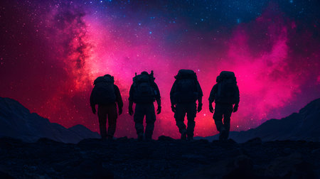Silhouette of four explorers in spacesuits on rocky terrain, facing a vibrant cosmic landscape of stars. The atmosphere exudes awe and excitement, with no clear background structure.