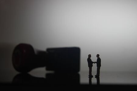 Dramatic Lighting, Simple Illustration Photo, Silhouette Two Man Handshaking for Business Agreement between big rubber stamp