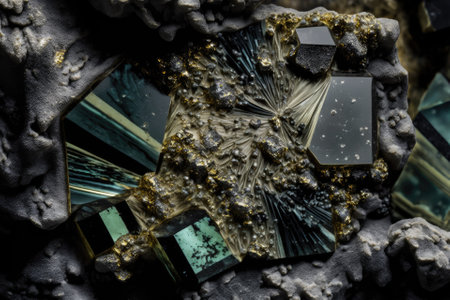 Geometric dark mineral formations featuring angular shapes contrast with shimmering gold deposits, creating a striking visual effect. ideal for modern decor, design inspiration, and creative art projects. Generative AI