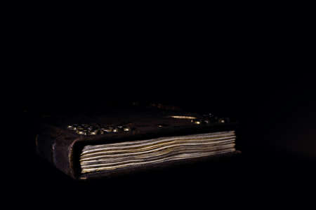 Low light old handmade leather cover notebook. Old leather cover and charred sheets isolated on black background. Underexposed stock photo.