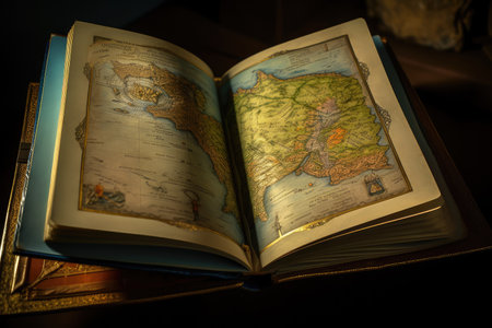 magical book, opening to reveal intricate and detailed map of unknown land, created with generative ai