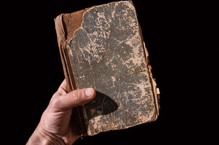 Old vintage book in a male hand on black background. old book