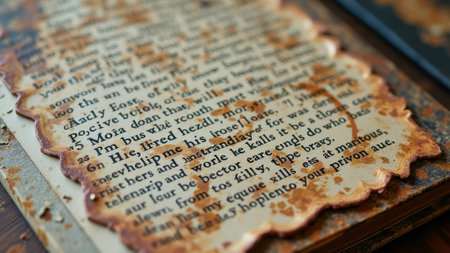 Close-up of vintage book page with aged and torn edges. That the image is generated using AI.
