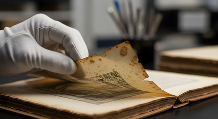 An archivist or researcher wearing a white glove carefully turns the fragile, foxed page of an ancient, illustrated book. The scene conveys the importance of handling historical artifacts with care, representing research, history, preservation, and the value of old documents.
