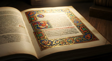 A close-up of a beautifully preserved medieval illuminated manuscript, open to a page with intricate, hand-painted decorations and shimmering gold leaf. The ornate borders and decorated initial caps showcase the exquisite artistry and craftsmanship of monastic scribes.