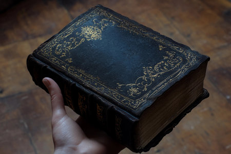 Fingers gently cradle a weathered book with dark, intricate bindings, revealing its aged charm. The warm ambiance hints at a timeless space, inviting exploration of forgotten stories.