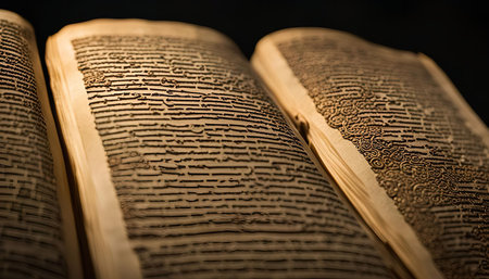 A vintage open book featuring ancient script rests on a rustic wooden surface, showcasing the beauty of historical literature and craftsmanship in an atmospheric setting.