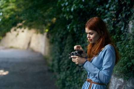 Woman in a hat with a camera in her hands red lips attractive look nature