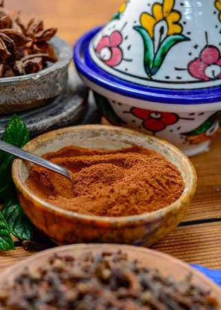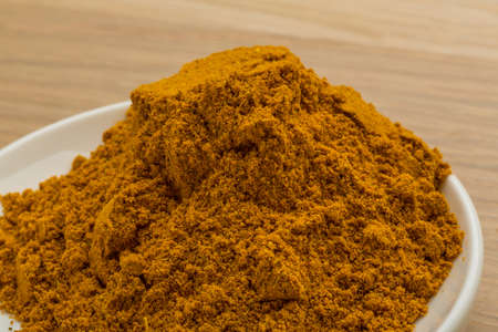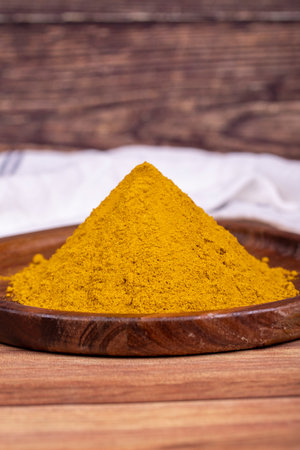 Curry powder on wooden background. Curry powder in wooden bowl. Mixture of spices and dried herbs. Spice concept. close up