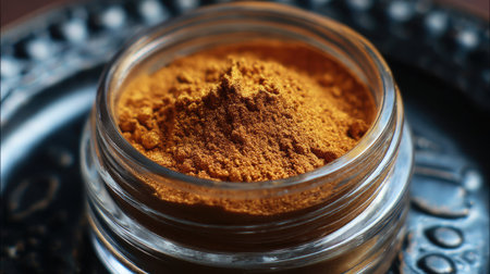 A close-up view of bright yellow turmeric powder elegantly displayed in a glass jar on a decorative tray. The rich texture and color highlight the spice's culinary versatility and health benefits.