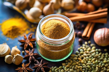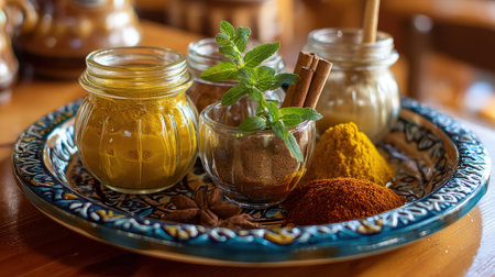 A visually appealing arrangement of colorful spices and herbs in jars on a decorative plate, perfect for adding flavor and aroma to any culinary creation.