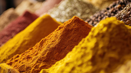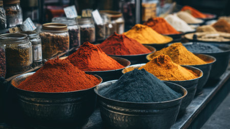 Discover a stunning display of spices in a traditional market, showcasing vibrant colors and rich textures that celebrate culinary diversity.
