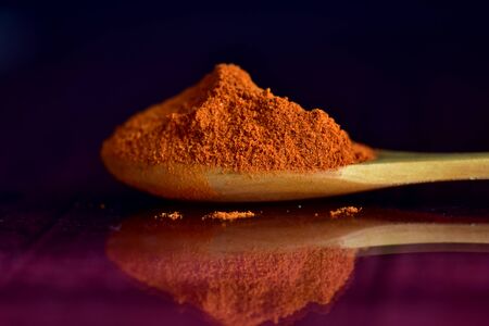 Hungarian hot paprika powder isolated on white background. Heap of traditional seasoning, wooden scoop