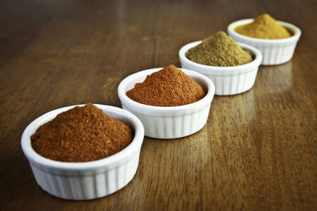 Spices in ramekins: paprika, chilli powder, cumin and turmeric