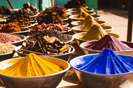 Vibrant heaps of spices create a colorful landscape at a local market in the afternoon, showing a diverse range of flavors and aromas to explore.