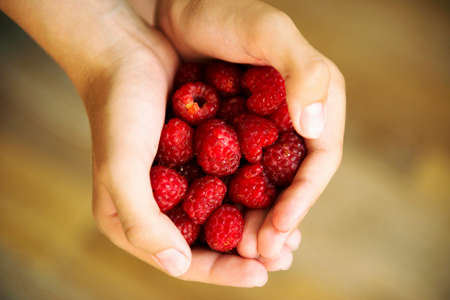 Ripe Red Raspberries on the child hands closeup. Raspberries in hands. Healthy, organic food and nutrition concept. eating, dieting, vegetarian food concept - close up of hands holding berries