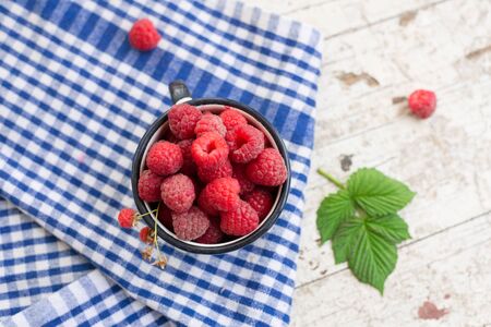 enamel vintage cup full of raspberries, summer taste on a blue striped tea towel
