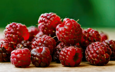 Indulge in the vibrant allure of juicy ripe raspberries showcased in this captivating top-view photograph. A transparent glass plate overflows with an abundance of plump and succulent raspberries, glistening with their natural juiciness. The vibrant red hues of the berries create a stunning contrast against the refreshing green background, evoking a sense of freshness and vitality. Each raspberry is a burst of flavor, offering a delightful balance of sweetness and tartness. The meticulous arrangement of the berries invites you to savor their irresistible charm. Whether enjoyed on their own, used as a topping or filling, or incorporated into various culinary creations, these raspberries are a true testament to nature's delectable bounty. Let your taste buds revel in the lusciousness of these vibrant gems, as you immerse yourself in their irresistible appeal.