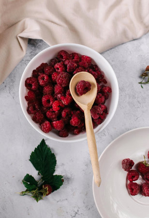 Top view on fresh pile of raspberries in white square bowl on gray background. Healthy eating. Vegan food