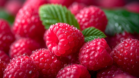 Close up view of fresh raspberries showcasing vibrant red color and rich texture, perfect for healthy eating and food photography